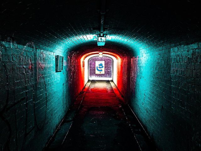 This tunnel is created by brick and painted white. But inside a tunnel is dark even the sun is shining the outside. However, this tunnel has several colours of lights. It makes vivid colour inside and also the bricks which painted white makes the colour of the light makes more bright.